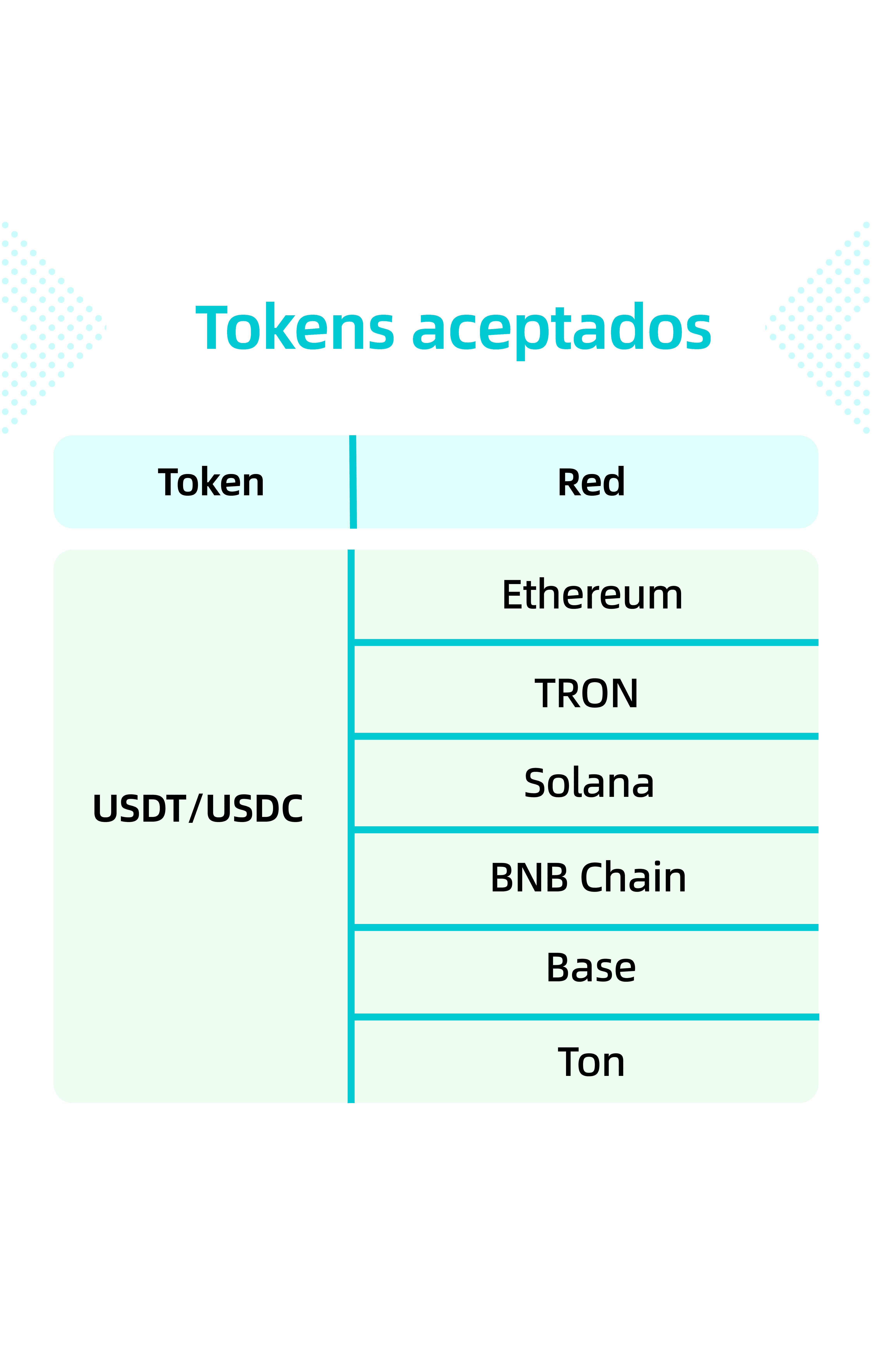 Puedes enviar <b>USDT y USDC en las redes BNB Chain, Solana, Base, Ethereum, TON y TRON</b>.