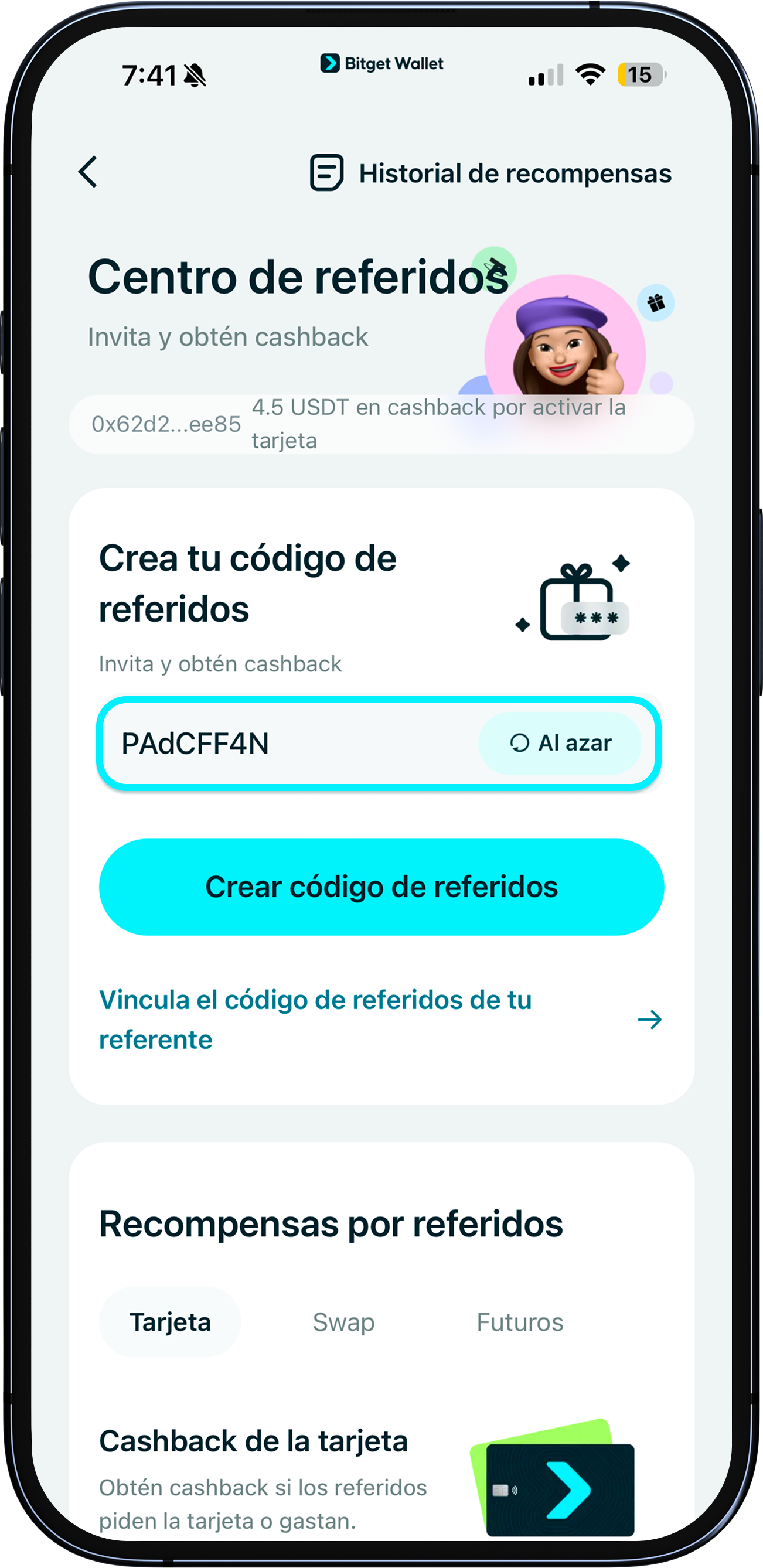 En Inicio, toca el icono Centro de Referidos situado en la esquina superior derecha. Toca Usar código de referidos y, a continuación, ingresa tu código para vincularlo.